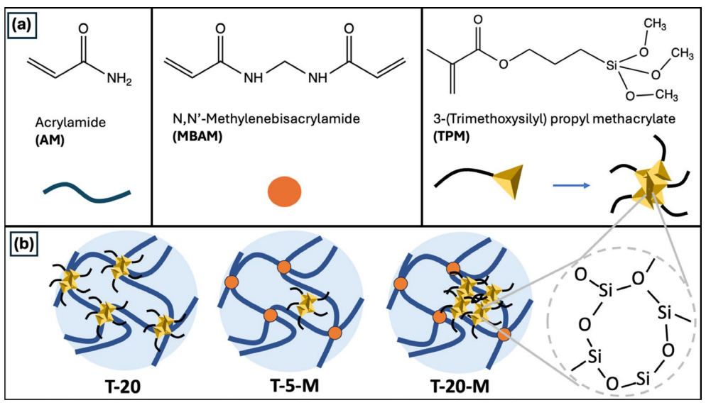 Chemical structures and schematics of silane-functionalized hydrogels that were incorporated into a 3D printable mortar (Hiller, et al., Journal of Applied Polymer Science 2026).